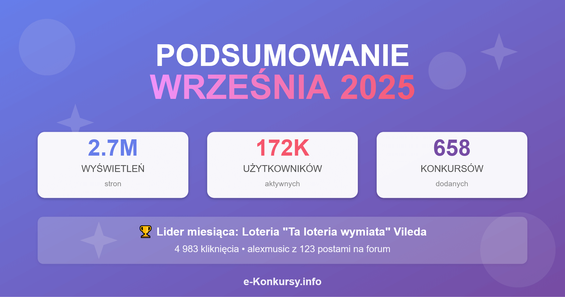 Wrzesień 2025 na e-Konkursy.info przyniósł imponujące wyniki – ponad 2,7 miliona wyświetleń stron, 6,6 miliona interakcji użytkowników i 172 tysiące aktywnych odwiedzających. Koniec wakacji i powrót do szkolno-pracowej rutyny nie zatrzymał entuzjazmu naszej społeczności, która aktywnie poszukiwała najlepszych okazji do wygrania atrakcyjnych nagród.
