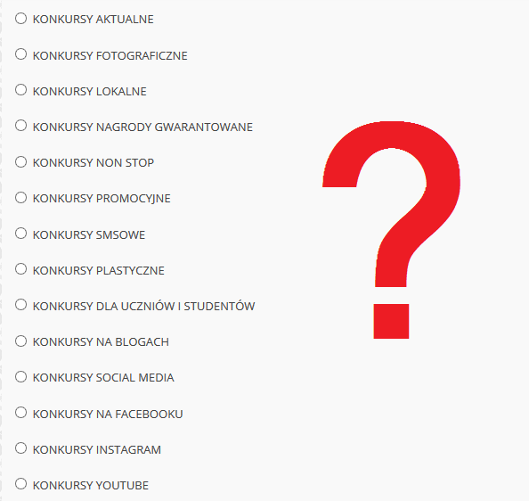 - Jeśli trzeba zrobić zdjęcie i wysłać na maila lub dodać na stronie to konkurs trafia do kategorii konkursy fotograficzne, jeśli zdjęcie trzeba opublikować na Facebooku to konkurs trafia do kategorii Konkursy na Facebooku z dopiskiem że jest to konkurs fotograficzny, jeśli konkurs odbywa się w określonym rejonie też trafia do tej kategorii tylko z dopiskiem dla jakiego regionu jest skierowany