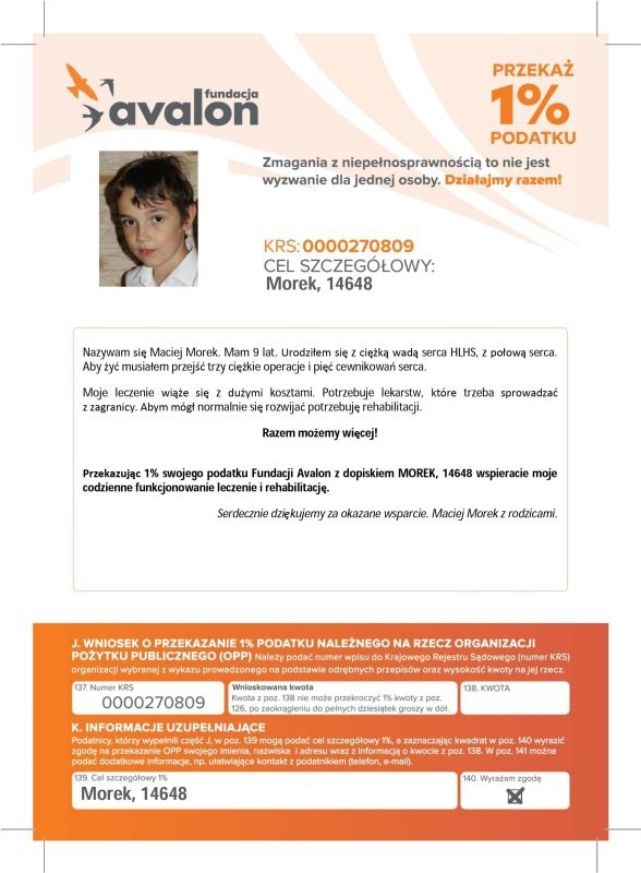 z dopiskiem: dla Adama Palbow na leczenie i rehabilitacjęAby przekazać 1% podatku, wystarczy w zeznaniu podatkowym wpisać dane: