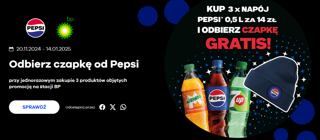 *Sprzedaż premiowa trwa od 20.11.2024 do wyczerpania produktów promocyjnych lub gratisów (25 000 czapek), jednak nie dłużej niż 14.01.2025 roku na wybranych stacjach BP.