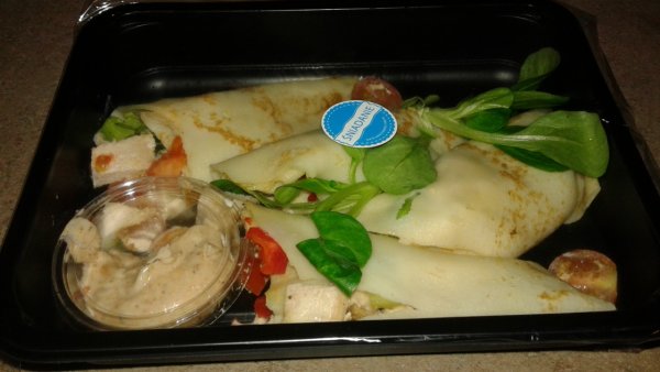 Dziś pysznie-choć nie jadam tego typu jedzenia na śniadanie-raczej lżej... Sałatka coś ala gyros w naleśniku. Spora porcja.
