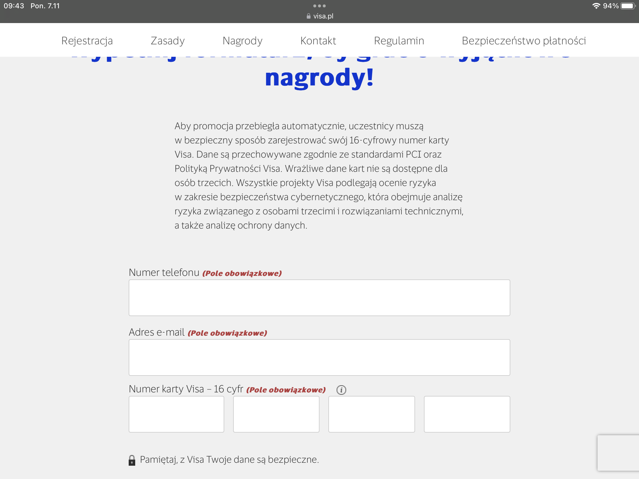 2 razy mam Wystąpił nieoczekiwany błąd. Spróbuj ponownie za chwilę. Jeśli błąd będzie się powtarzał, skontaktuj się z organizatorem: loteria.visa.millennium@uniqueone.pl
