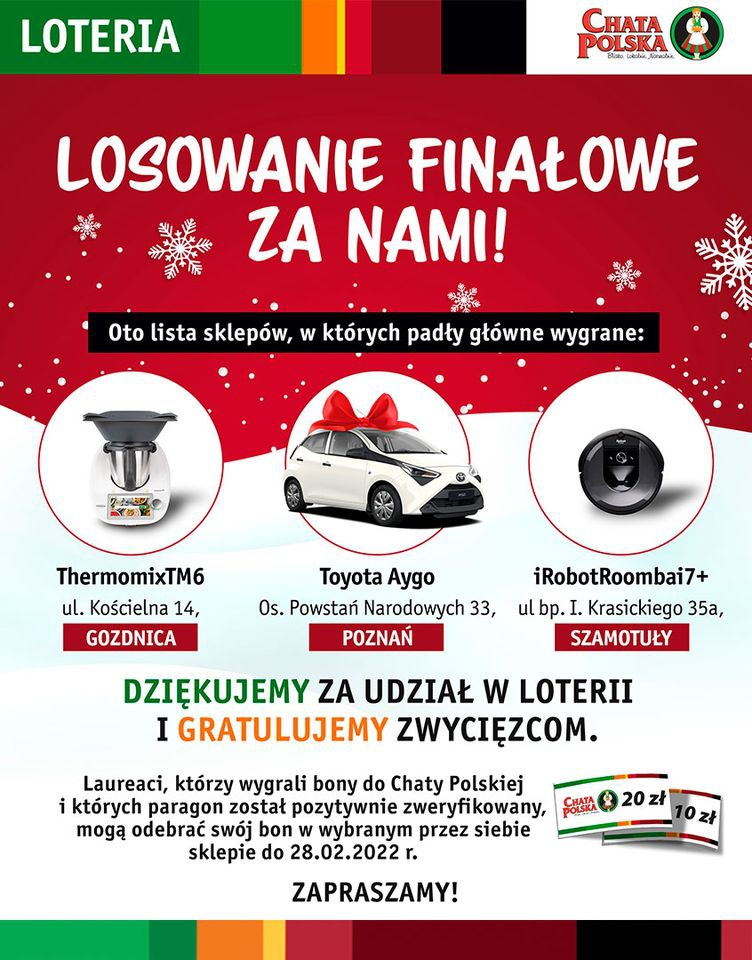 Główna nagroda – samochód marki Toyota Aygo – został wylosowany przez Klientkę sklepu Chata Polska na osiedlu Powstań Narodowych w Poznaniu.