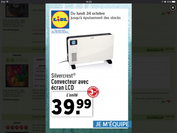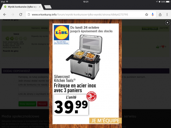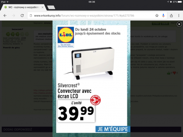 Za każdym razem reklama lidla, da się ją zamnknąć. U mnie pojawia się na niektórych stronach i nie zawsze. Ale tylko na forum, na stronach z konkursami nie.