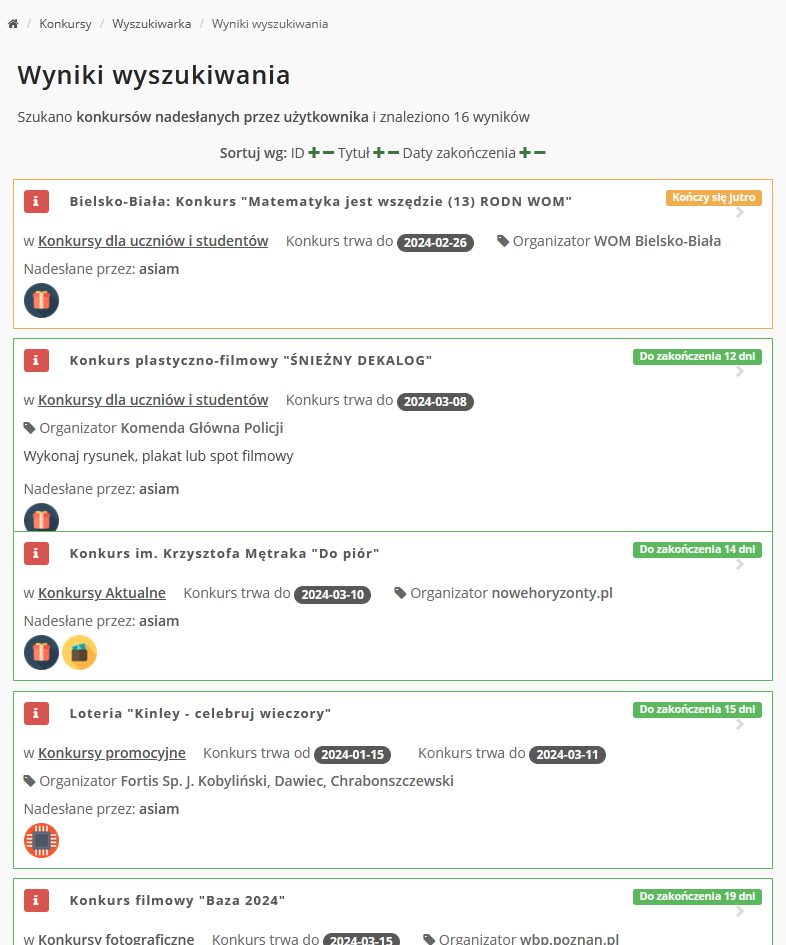 Przedwczoraj przed południem i wieczorem dodawałem konkursy, ten wieczorny jest dodany te wcześniejsze nie. Nie ma też info o odrzuceniu. Przy ponownym dodaniu info że konkurs widnieje już w bazie. Jest może jakiś wiekszy problem z zatwierdzaniem? 0 0