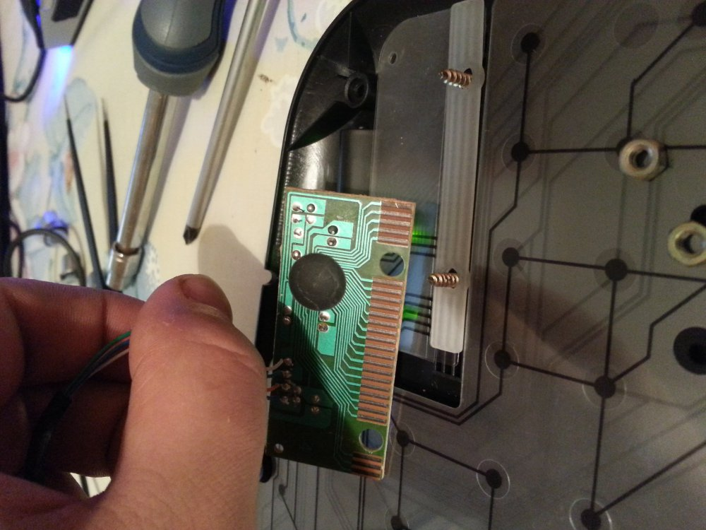 Jeśli się nie mylę i faktycznie ją rozkręcałaś, to proponuję delikatnie rozkręcić raz jeszcze, dobrze wysuszyć folię w środku i sprawdzić (pod lupką?) czy te srebrzyste ścieżki idące od styków nie są gdzieś przetarte/przerwane. Spróbuj delikatnie wyjąć i tak samo delikatnie, z wyczuciem włożyć drugi raz do tego gniazdka, ale równo, nie po skosie. Może być też tak, że folia jest przykręcana do płytki dwiema śrubkami (patrz drugie zdjęcie) i tam coś nie dociska...