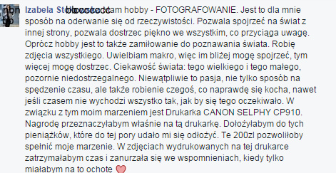 Mam hobby - FOTOGRAFOWANIE. Jest to dla mnie sposób na oderwanie się od rzeczywistości. Pozwala spojrzeć na świat z innej strony, pozwala dostrzec piękno we wszystkim, co przyciąga uwagę. Oprócz hobby jest to także zamiłowanie do poznawania świata. Robię zdjęcia wszystkiego. Uwielbiam makro, więc im bliżej mogę spojrzeć, tym więcej mogę dostrzec. Ciekawość świata: tego wielkiego i tego małego, pozornie niedostrzegalnego. Niewątpliwie to pasja, nie tylko sposób na spędzenie czasu, ale także robienie czegoś, co naprawdę się kocha, nawet jeśli czasem nie wychodzi wszystko tak, jak by się tego oczekiwało. W związku z tym moim marzeniem jest Drukarka CANON SELPHY CP910. Nagrodę przeznaczyłabym właśnie na tą drukarkę. Dołożyłabym do tych pieniążków, które do tej pory udało mi się odłożyć. Te 200zl pozwoliłoby spełnić moje marzenie. W zdjęciach wydrukowanych na tej drukarce zatrzymałabym czas i zanurzała się we wspomnieniach, kiedy tylko miałabym na to ochotę Emotikon heart