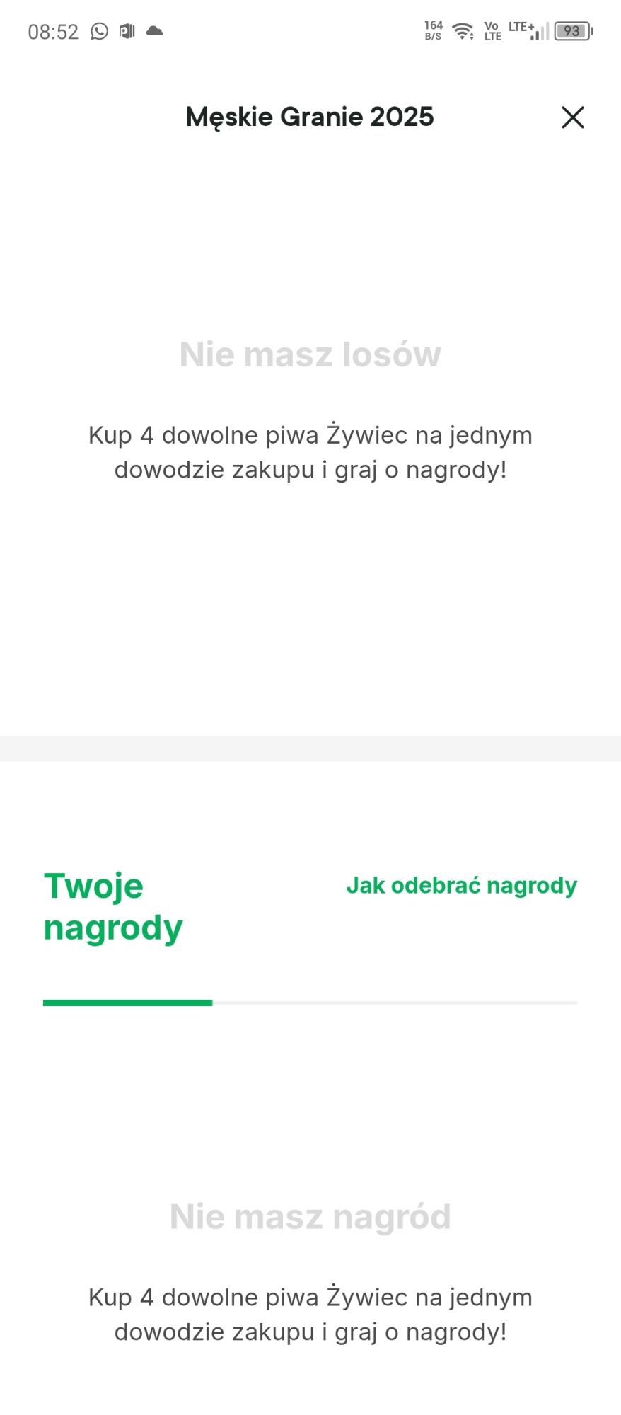 Nie. W miejscu, gdzie masz teraz napisane "nie masz losów", powinien się pojawić taki zielony kapsel. Po kliknięciu w niego pojawia się 9 kółek (logo Żywca, Żabki, itp.). Po wybraniu jednego z kółek pojawia się nagroda. A potem ta nagroda jest w sekcji "Twoje nagrody". Wyświetl w wątku >>