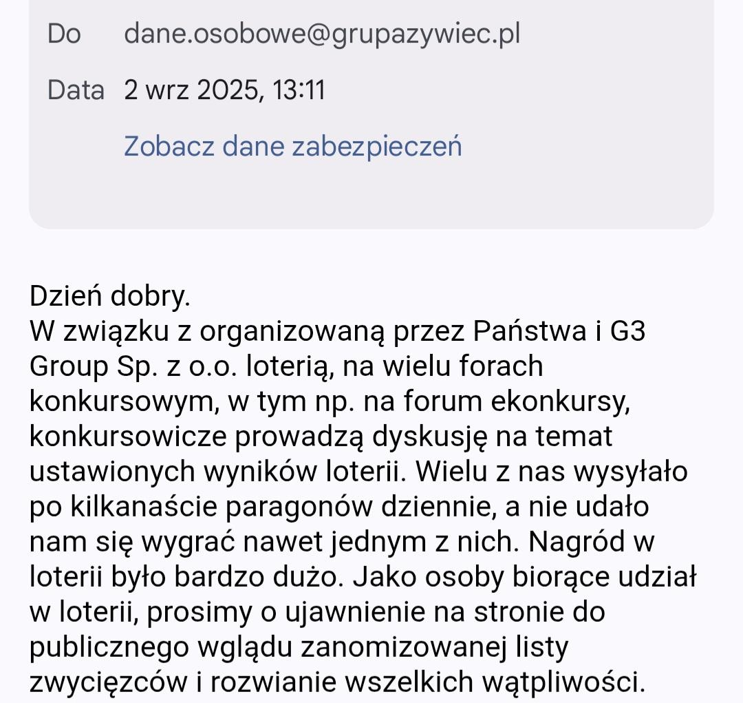 Napisałam do Namysłowa i do G3 organizującego loterię bo śmierdzi mi to na kilometr...