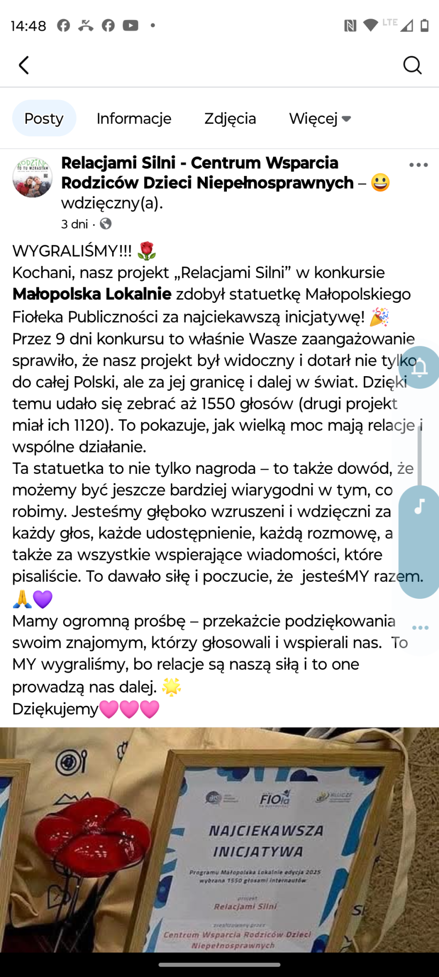 Na projekt "Relacjami Silni" czyli nicjatywe inicjatywa dla dzieci niepełnosprawnych oraz opiekunów osób niepełnosprawnych 🌷 projekt wygrał 1 miejsce - nagrodę publicznosci 1250zl na cele statutowe.