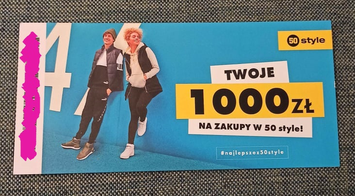 - bon 1000zł 50STYLE do wykorzystania stacjonarnie lub online na ubrania, obuwie, akcesoria sportowe itd. (marki takie jak Nike, Adidas, Converse, New Balance, Fila, Vans, Reebok i inne), ważny do końca 2022, cena 700zł