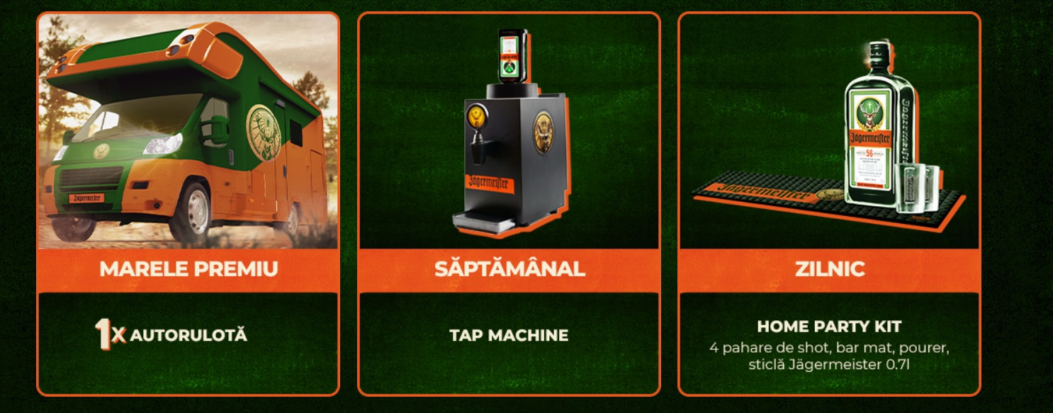 Jagermeister zakupu minimum butelka 0,7. Do wygrania przyczepa kempingowa o wartości ok. 190 tysięcy złotych lub można wybrać równowartość w gotówce. 6 x dozownik do Jagermeistera, i 42 x butelka Jagermeistera 0,7 plus 4 kieliszki i mata. U nas chyba dają butelkę 0,5 i 2 kieliszki