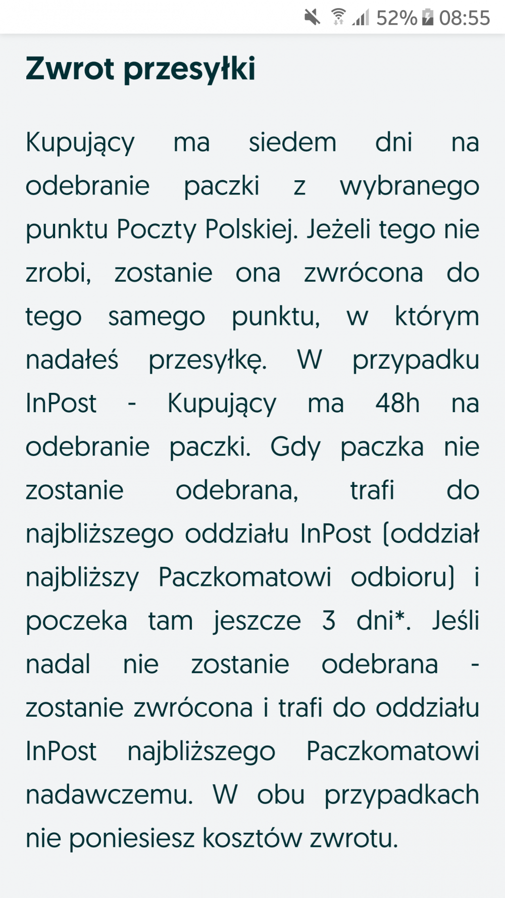 Ostatnio z Inpostem jest taki problem, że jeśli ktoś pobrał wcześniej aplikację i nawet ją usunął to od tego momentu przestaje dostawać smsy z informacją, że paczka dotarła i kodem odbioru, ja wysyłałam ostatnio przez olx i właśnie kilka osób pisało do mnie, że na śledzeniu pokazuje im, że paczka już jest dobę w paczkomacie a nie dostali żadnej informacji, że już tam dotarła, dzwoniłam na infolinię właśnie mi pani wyjaśniła jak to działa Wyświetl w wątku >>