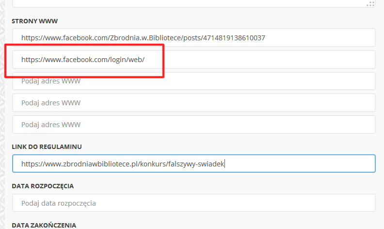 Dodając konkurs zaczyna się od wklejenia adresu do sprawdzenia, potem wypełniam poszczególne pola formularza, a kiedy zjechałem do pola na adres regulaminu, zauważyłem ze zdumieniem, że wcisnął się jakiś inny adres, którego absolutnie nie wrzucałem! SAM z siebie się wepchnął. Na chama, bez pytania.
