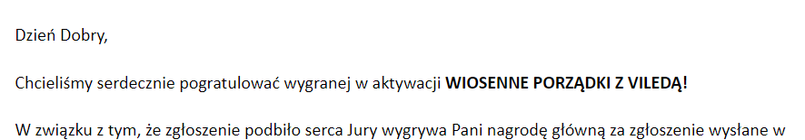 Po ponad pół rocznej przerwie (ale ten czas leci) wracam do konkursów i na dzień dobry przywitało mnie tysiąc złotych z Viledy emotka
