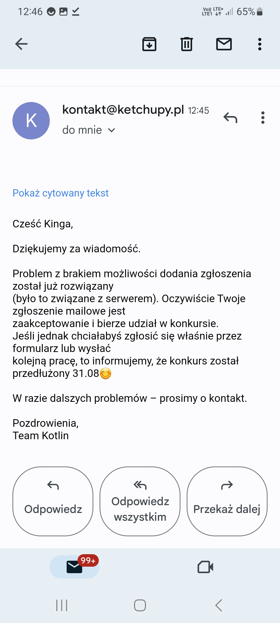 Fajnie, nieczęsto spotykam się z tak życzliwą i szybką odpowiedzią na maila z zapytaniem odnośnie konkursu 🥰 Wyświetl w wątku >>