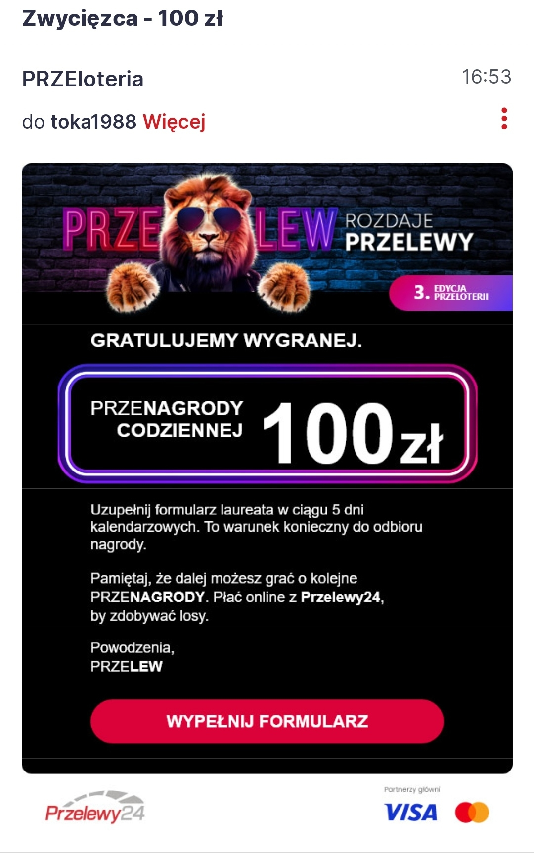 Mnie się teraz udało sprawdzić wszystkie swoje zarejestrowane zdrapki (24 sztuki) i niestety wszystkie wyniki negatywne. Ale chętnie bym się dowiedziała czy ktoś wygrał chociaż 300 zł na zakupy. Ale czy czasem w ostatniej loterii Kaufland Card nie było analogicznie? Że nikt z forum nie wygrał nawet tej najmniej wartościowej nagrody? Wyświetl w wątku >>