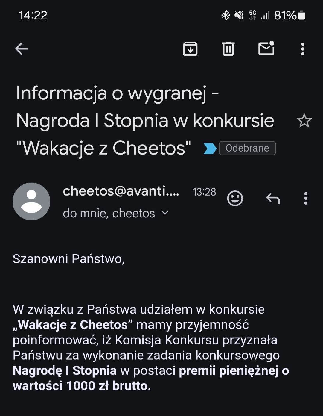 Edit. 5 min później mail nagroda III stopnia - kufle. Wyświetl w wątku >>