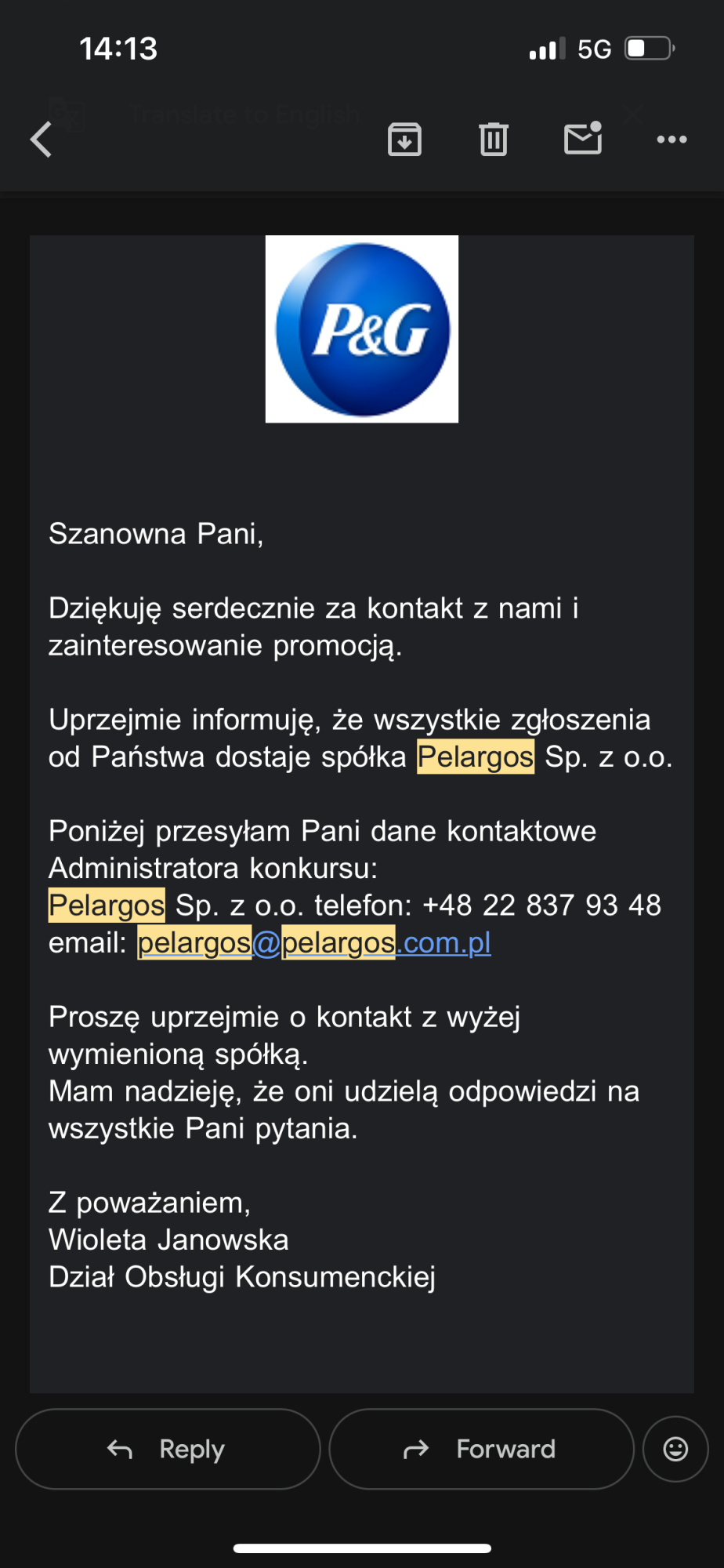 Ponad 50 zł na paragon w Ariel i Lenor i null,  zastanawiam się, czy w ogóle to zgłoszenie do nich doszło, bo nie wyświetlił się numer emotka  Everydayme odesłał mnie do pelagrosa, a pelagrosa milczy od wczoraj Wyświetl w wątku >>