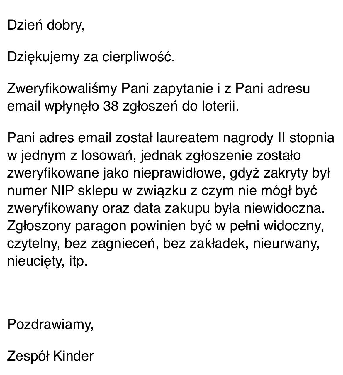 Wysłałam 38 zgłoszeń na konkurs Kinder , przez co dziwne wydawało mi się brak glupiej piniaty . Wysłałam maila i taką dostałam odpowiedź …. Eh emotka Wyświetl w wątku >>