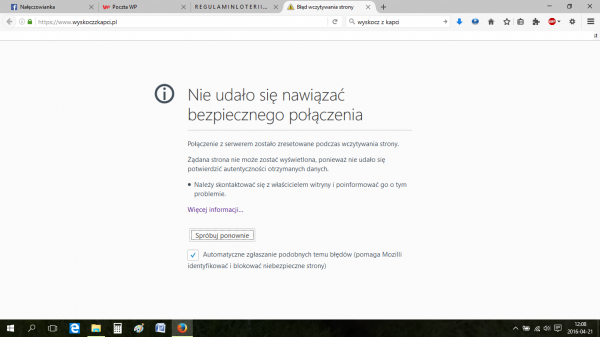 Nie wiem jaki to błąd ale jeśli tak jak u mnie (codziennie to samo) to sprawdź czy w pasku adresu masz poprawny adres... U mnie są dwa jakieś pomieszane, i jak skasuję ten pierwszy do HTTP:// to wtedy wychodzi poprawnie Wyświetl w wątku >>