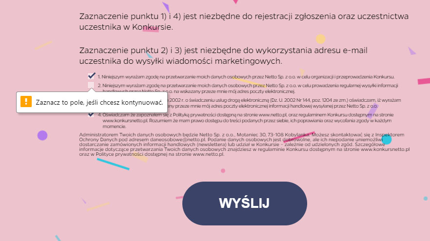 mają jakiś błąd, który nie pozwala przejść dalej, jeśli nie zaznaczy się zgód marketingowych.