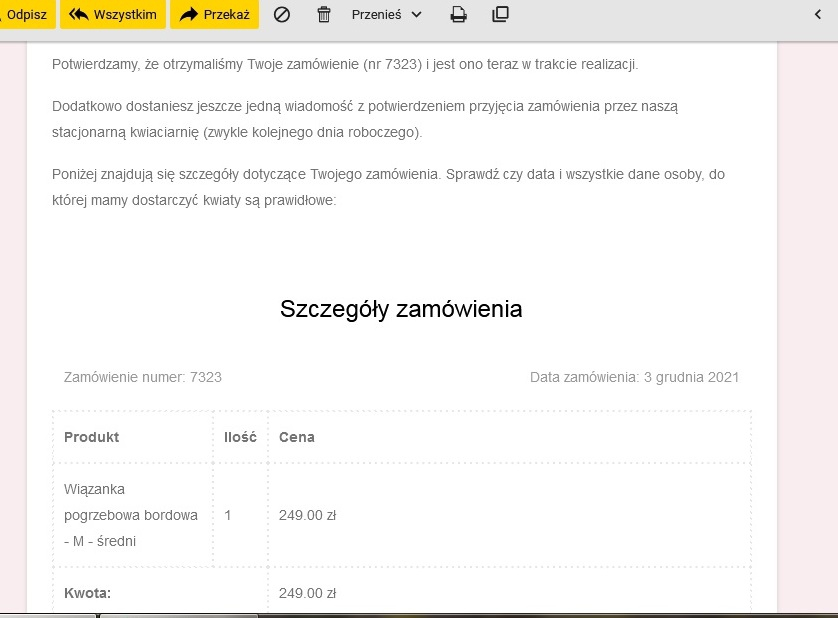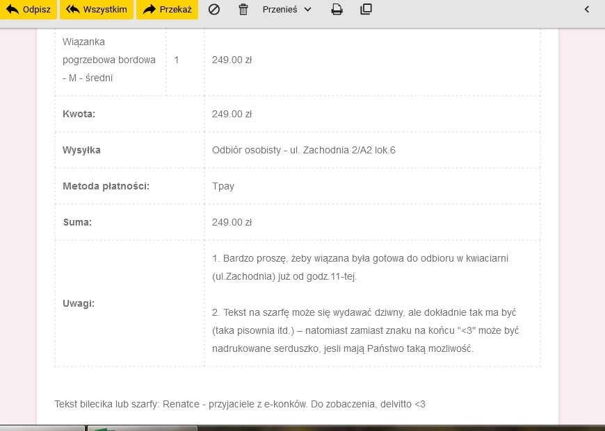 Niżej dwa screeny potwierdzenia (aż dwa dlatego, że nie rejestrowałam się na stronie kwiaciarni, więc mam potwierdzenie tylko na mailu, a wyjątkowo dużą płachtę przysłali