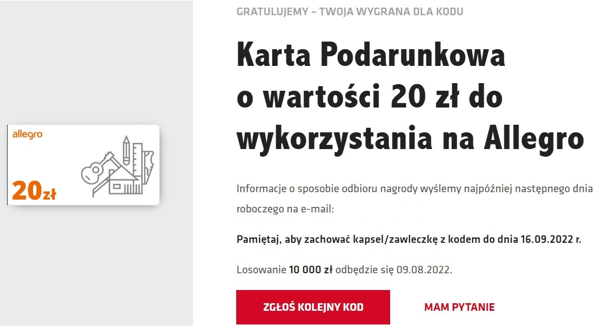 Po wysłaniu maila do Żabki po 5 minutach otrzymałam kod