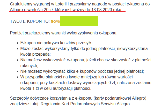 W Loterii Visa wygrałeś ekupon do Allegro o wartości 20 zł. Wyświetl w wątku >>