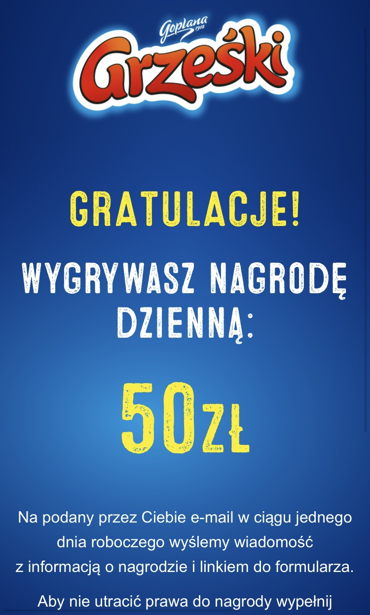 Winiary: Gratulacje Zostales Laureatem Nagrody Instant Win w Loterii Smak inspiracji,smak wygranej! w postaci 50,00 zl