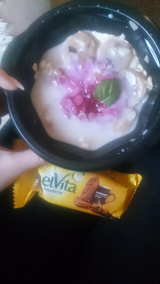 Nie było mnie 3 dni w domu i śniadania za mnie jadła córa. Mówi,że są pyszne i bardzo syte. Do mnie dowożą śniadania z Wrocławia (ok 36 km) mniej więcej na umówioną wcześniej godzinę. We wtorek była owsianka (zdjęcie środkowe). z bananami, malinami i migdałami. W środę-kanapki z sałatą, łososiem i jajkiem na ciemnym chlebie a dzisiaj omlet z szynką i czymś jeszcze ale córa nie wiedziała z czym
