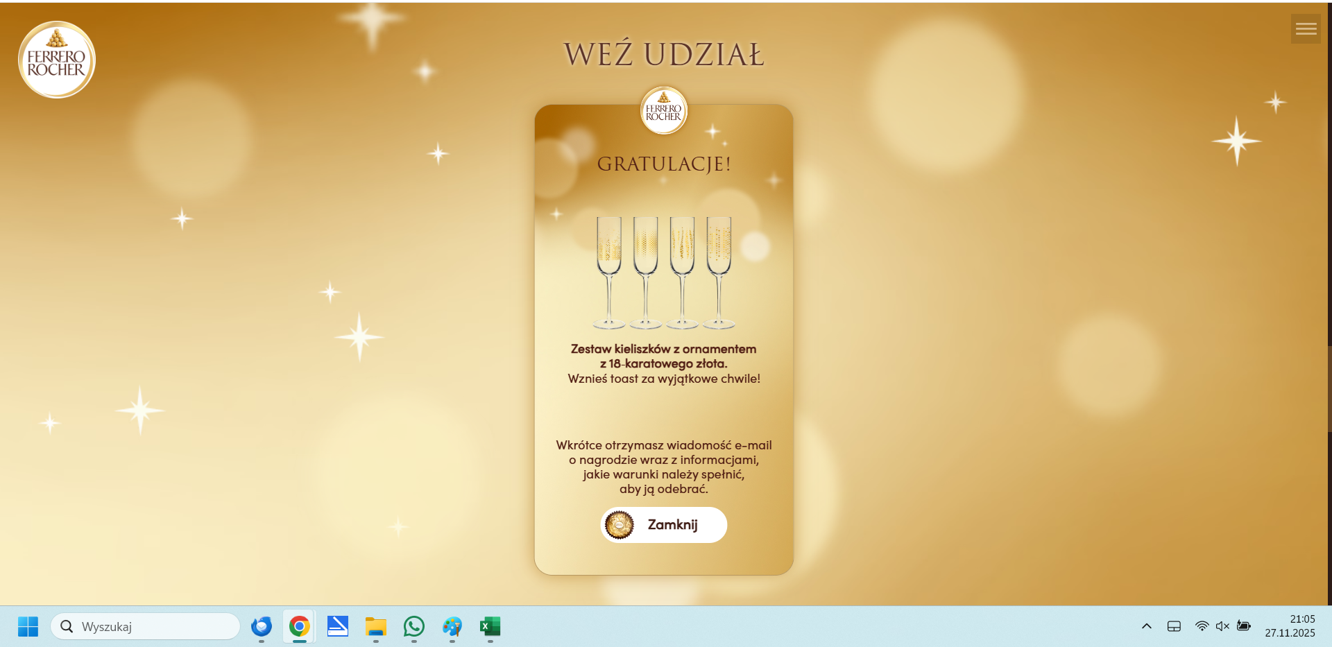 Udało się wygrać kieliszki ale @ informujący o nagrodzie i info jak odesłać paragon póki co nie przyszedł  emotka  Może ktoś tez wygrał i napisze w jakim czasie po wygranej przysłali @ ?