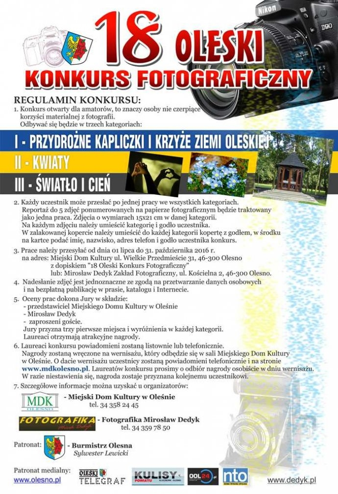 Konkurs na fotografie w kategoriach: Przydrożne kapliczki i krzyże Ziemi Oleskiej, kwiaty, światło i cień.