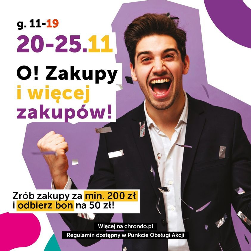 - Odbierzcie bon o wartości 50 zł w Punkcie Obsługi Akcji (w godz. 11:00-19:00) do wykorzystania w wybranych sklepach CH Rondo w czasie trwania akcji