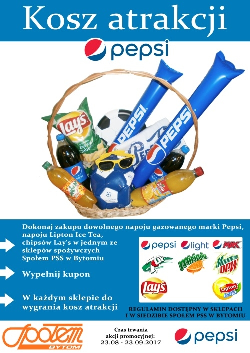Dokonaj dowolnego zakupu napoju gazowanego marki Pepsi, Lipton Ice Tea, chipsów Lays w jednym ze sklepów spozywczych Społem PSS w Bytomi. Wypełnij kupon.