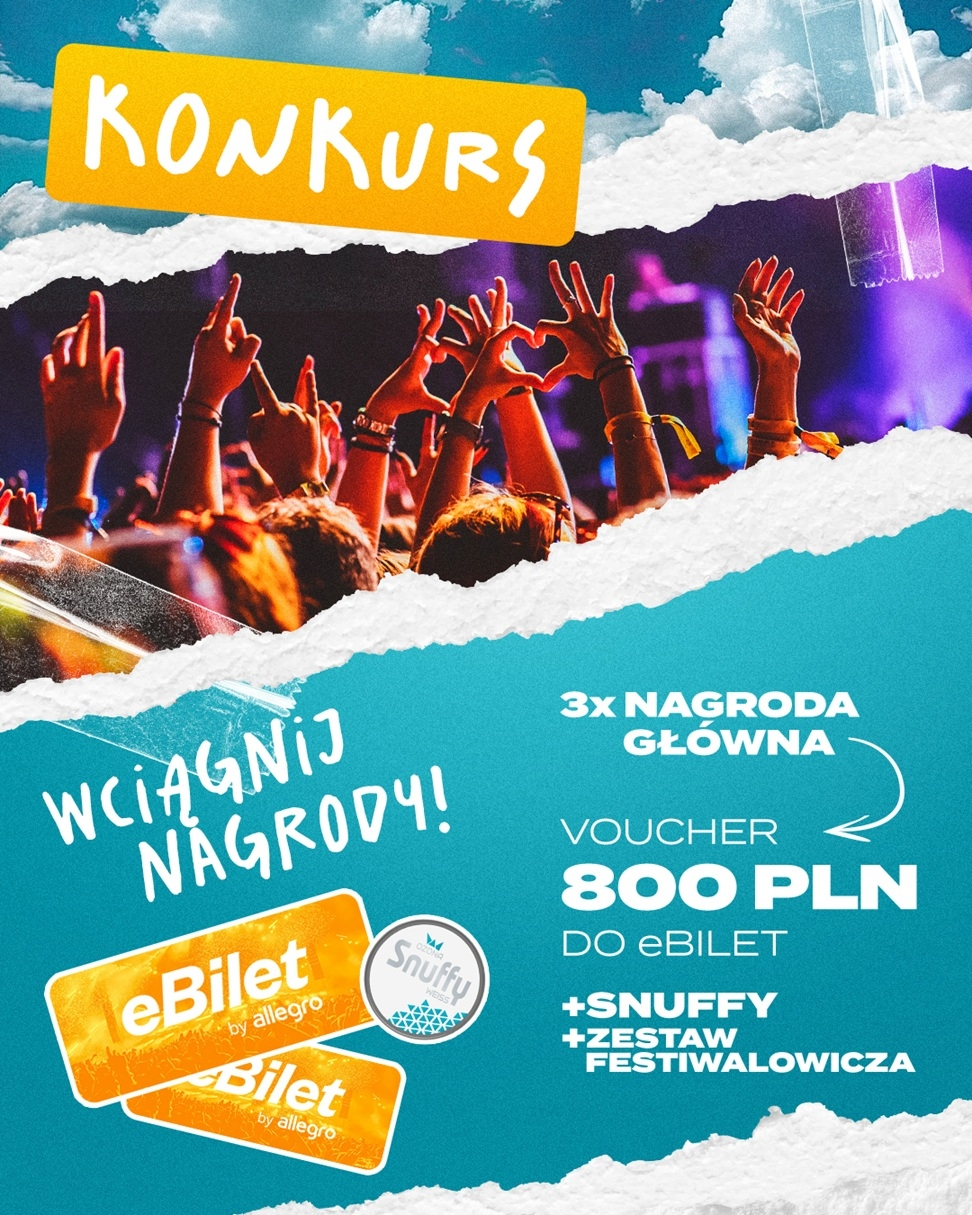 3x voucher do eBilet o wartości 800 PLN + zestaw festiwalowicza, w skład którego wchodzą: trzy opakowania Snuffy Weiss, jedne okulary, jedna smycz, jeden bidon