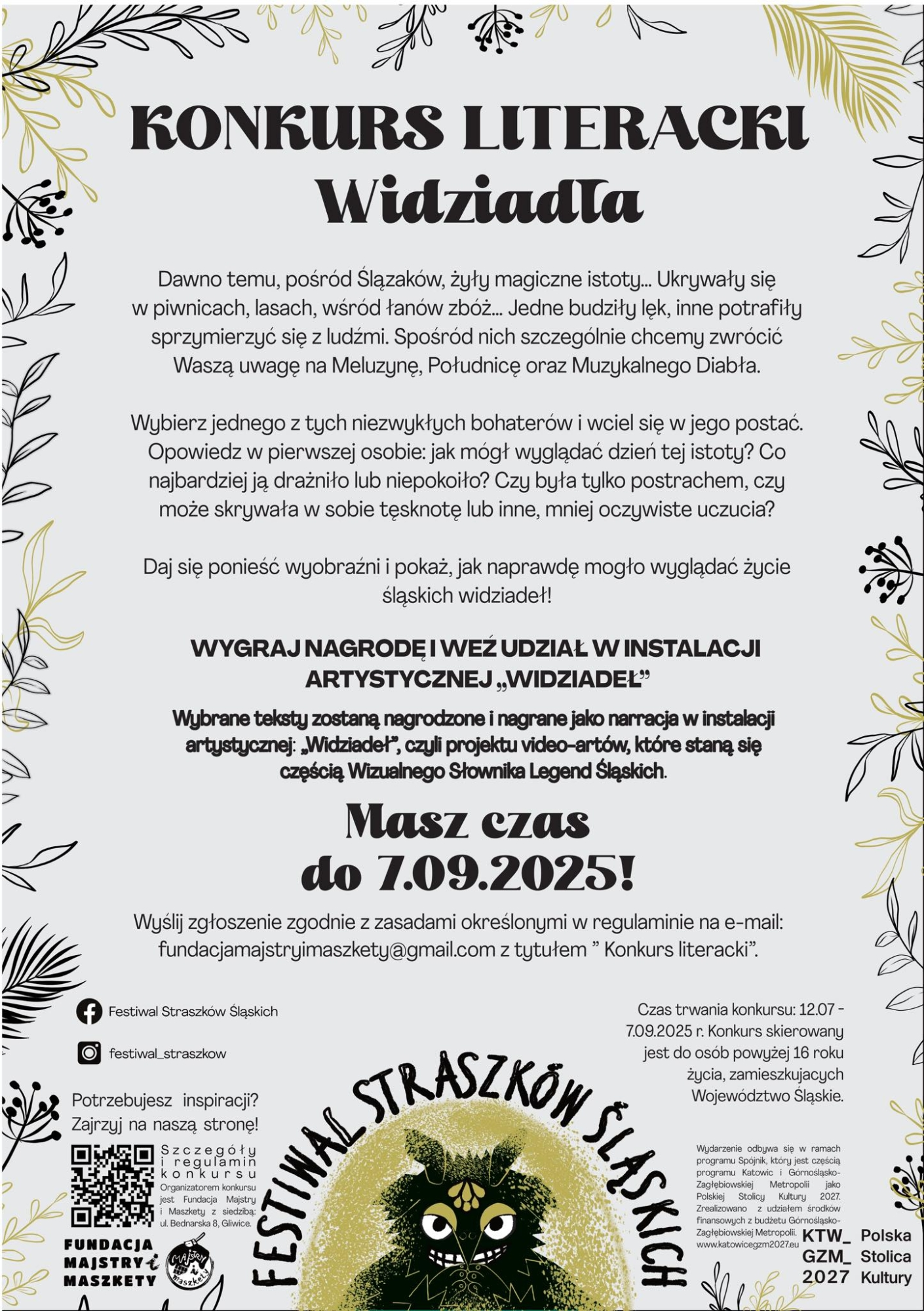 Dawno temu, pośród Ślązaków, żyły magiczne istoty… Ukrywały się w piwnicach, lasach, wśród łanów zbóż… Jedne budziły lęk, inne potrafiły sprzymierzyć się z ludźmi. Spośród nich szczególnie chcemy zwrócić Waszą uwagę na Meluzynę, Południcę oraz Muzykalnego Diabła.Wybierz jednego z tych niezwykłych bohaterów i wciel się w jego postać. Opowiedz w pierwszej osobie: jak mógł wyglądać dzień tej istoty? Co najbardziej ją drażniło lub niepokoiło? Czy była tylko postrachem, czy może skrywała w sobie tęsknotę lub inne, mniej oczywiste uczucia?Daj się ponieść wyobraźni i pokaż, jak naprawdę mogło wyglądać życie śląskich widziadeł!Meluzyna – „Według podań ludowych, Meluzyna była niegdyś piękną kobietą, która za swą pychę, grzechy i brak troski o własne dzieci została wypędzona na nędzę i słotę. Odtąd błąka się po świecie szukając spokoju, a jej nadejście zawsze zwiastuje porywisty wiatr lub deszcz.Słysząc ją, należało szybko otworzyć okno i rzucić na wiatr szczyptę mąki lub soli, by mogła nimi nakarmić swoje zgłodniałe dzieci.”Południca (Połednica) – „Demon ten pojawiał się w okresie dojrzewania zbóż, najczęściej w samo południe. Południce były różnie opisywane, przeważnie jako kobieta odziana w białe lub błękitne szaty z chustką zawiązaną pod szyją, która nie reagując na nic idzie przed siebie. Południca zjawiała się zwykle w pierwszej popołudniowej godzinie, najczęściej w bezchmurne i gorące dni.Jeśli była bardzo zła, wtedy dusiła ludzi, skręcała im karki, łamała ręce i nogi. Czasem zaś tylko straszyła, a tych, którzy nie mieli przy mocnym słońcu nakrycia głowy, przyprawiała o ból nie do wytrzymania.”Dioboł – „Według śląskich wierzeń diabła można rozpoznać po nogach zakończonych kopytami, rogach na głowie i zapachu siarki. Czasem też kuleje, która to ułomność wywodzi się stąd, że spadając z nieba złamał nogę. Na ziemi może jednak przyjąć również każdą inną postać z wyjątkiem gołębia i baranka (atrybuty chrześcijaństwa). Najczęściej mieszka w starych spróchniałych drzewach lub piecach.”Diabły porywały dusze ludzi do piekła. Niektóre z nich, np. dioboł knurowski – kochały dźwięk skrzypiec… stąd wzięła się legenda o muzykalnym diable.Fragmenty książki: „O dioble złośliwym i utopku życzliwym czyli legendy i wierzenia powiatu gliwickiego” Wciel się w wybranego stwora z powyższych i stwórz narrację do postaci w pierwszej osobie: jak mógł wyglądać ich dzień? Co go lub ją drażniło najbardziej? Czy był „tylko” straszny? Może za czymś lub za kimś tęsknił? Teksty powyżej to tylko inspiracje – jeśli znasz inne legendy lub podania na temat ich wyglądu, zachowań – wykorzystaj te, które bardziej do Ciebie przemawiają.Wybrane teksty zostaną nagrane jako narracja w instalacji artystycznej: „Widziadeł”, czyli projektu video-artów, które staną się częścią Wizualnego Słownika Legend Śląskich.Inspiracje można zaczerpnąć ze strony festiwalu: ŚLĄSKIE STRASZKICzas trwania konkursu: od 12.07 do 7.09.2025 r.Organizatorem konkursu jest Fundacja Majstry i Maszkety.Wydarzenie odbywa się w ramach programu Spójnik, który jest częścią programu Katowic i Górnośląsko-Zagłębiowskiej Metropolii jako Polskiej Stolicy Kultury 2027. Zrealizowano z udziałem środków finansowych z budżetu Górnośląsko-Zagłębiowskiej Metropolii. www.katowicegzm2027.eu