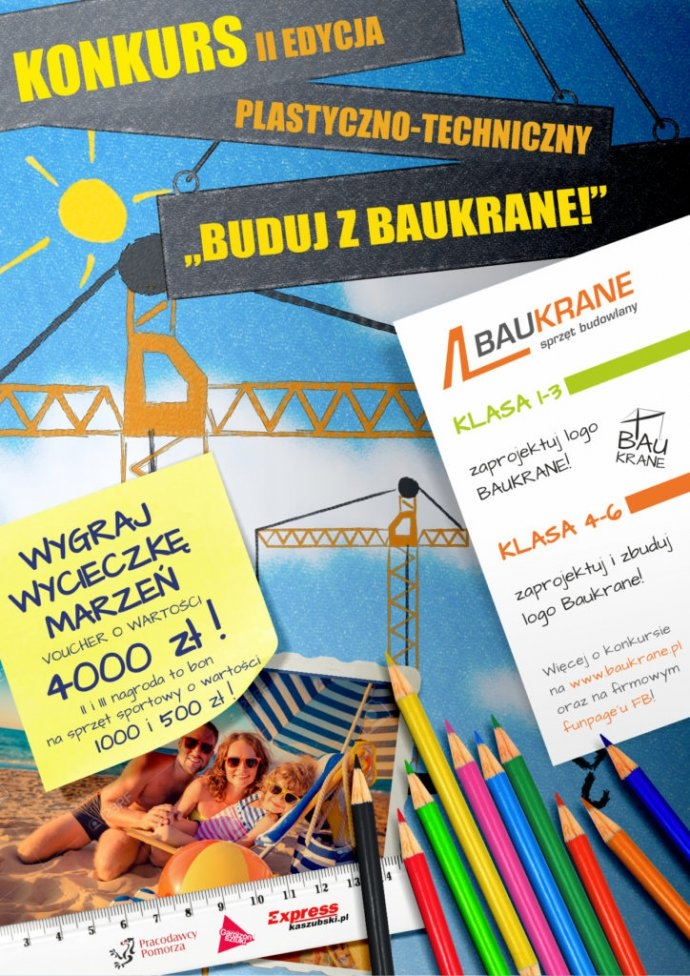 - dzieci z klas 1-3 – do wykonania dowolną techniką praca plastyczna na temat: „Zaprojektuj logo BAUKRANE” (format pracy dowolny),