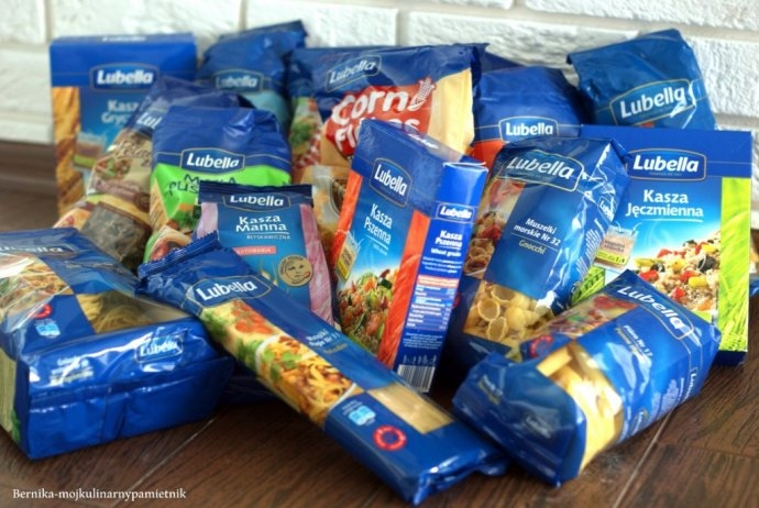 2 jednakowe zestawy 18 opakowań produktów Lubella: makarony, mąki, kasze, płatki śniadaniowe.