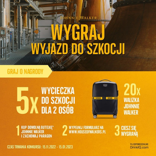 *Jednym z warunków uczestnictwa w konkursie jest jednorazowy zakup – w terminie trwania Konkursu, produktów marek Johnnie Walker lub dowolnego zestawu promocyjnego, w skład którego wchodzi Johnnie Walker z wykluczeniem pojemności 0,05 litra, 0,2 litra, 0,35 litra, 0,5 litra oraz zachowanie paragonu dokumentującego ten zakup.