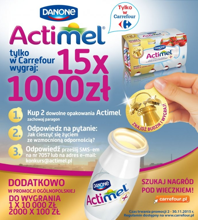 Kup w Carrefour minimum 2 promocyjne opakowania Actimela, odpowiedz na pytanie: Jak cieszyć się życiem ze wzmocnioną odpornością?” Odpowiedź wyślij na adres: konkurs@actimel.pl lub poprzez wiadomość SMS na numer 7057 według wzoru: Actimel.Twoja Odpowiedź na pytanie