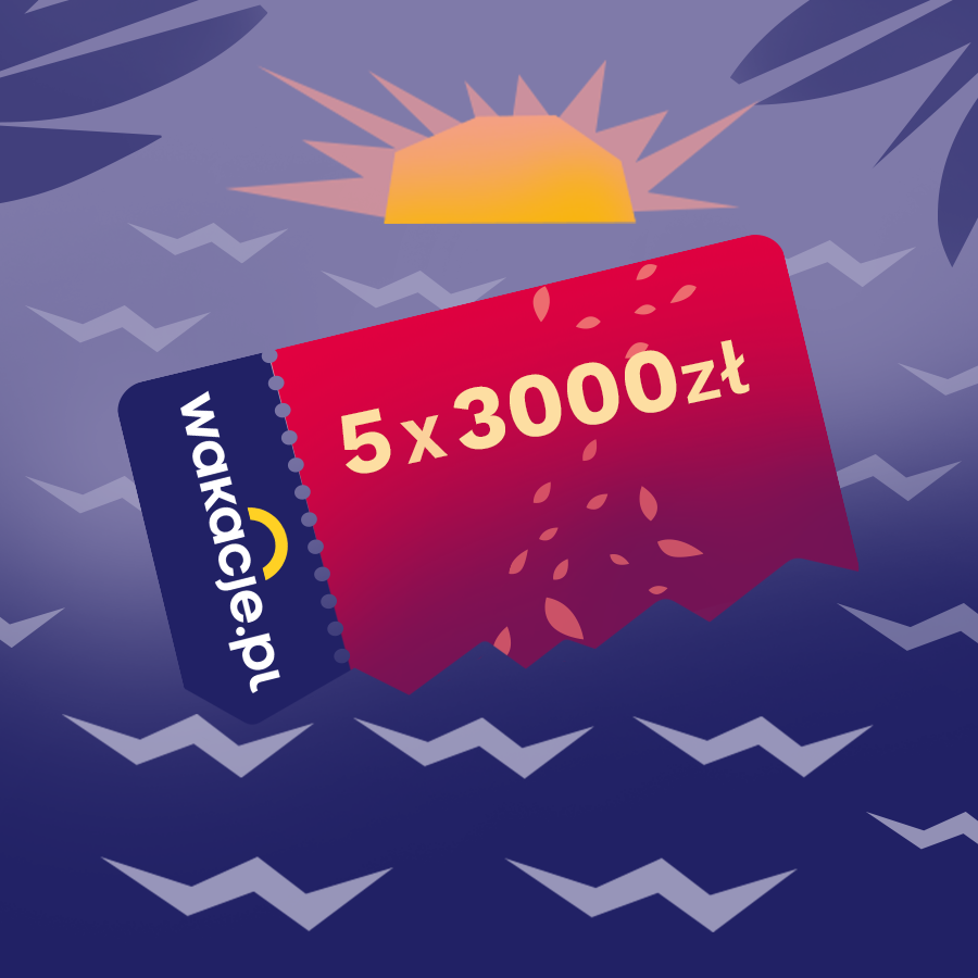 5x voucher o wartości 3000 zł do wykorzystania na dowolne wakacje z wakacje.pl