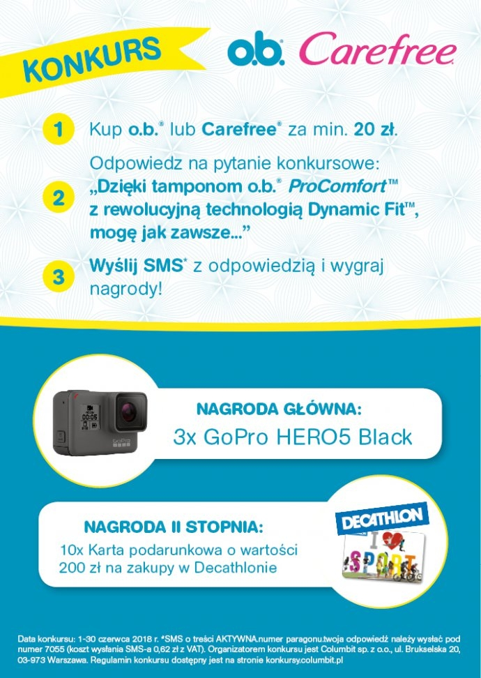 Kup O.B. lub Carefree za min. 20 zł, odpowiedz na pytanie konkursowe: „Dzięki tamponom o.b. z rewolucyjną technologią Dynamic Fit mogę jak zawsze ...”, wyślij SMS na numer 7055 o treści: