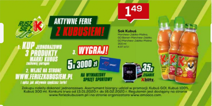 Kup jednorazowo 3 produkty marki Kubuś, zachowaj paragon, wejdź na stronę feriezkubusiem.pl i napisz jak aktywnie spędzasz ferie.