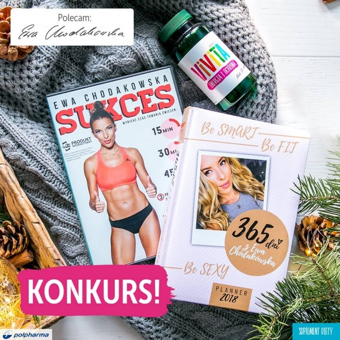 5 zestawów: suplement diety ViVita, płyta z treningami Sukces oraz kalendarz na rok 2018 Ewy Chodakowskiej.