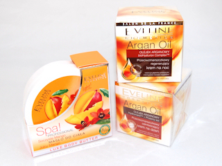 zestaw Eveline Cosmetics. W skład zestawu wchodzą: Przeciwzmarszczkowy odmładzający krem na dzień Argan Oil, Przeciwzmarszczkowy regenerujący krem na noc Argan Oil, Masło do ciała soczyste Spa! Professional.