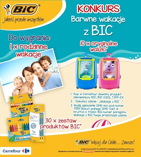 Aby wziąć udział w Konkursie należy w dniach od 29.07.2015 roku do dnia 18.08.2015 roku dokonać zakupu minimum 1 produktu piśmienniczego oznaczonego logo BIC, BIC KIDS, TIPP-EX w sklepach sieci Carrefour oraz dokonać zgłoszenia wysyłając SMS-a pod numer 7055 z dokończeniem zdania "Wakacje z BIC..."