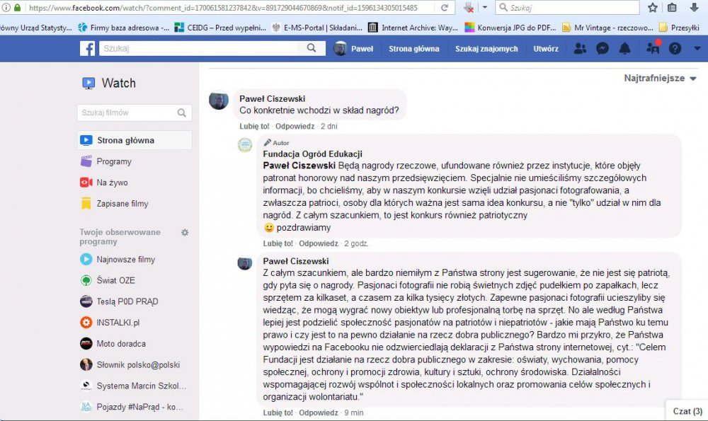 30.07.2020 23:56:29Zapytałem organizatora o nagrody i już nie jestem patriotą (na szczęście tylko według jakiejś osóbki z tej "fundacji"). Tutaj moje pytanie i kuriozalna odpowiedź organizatora: