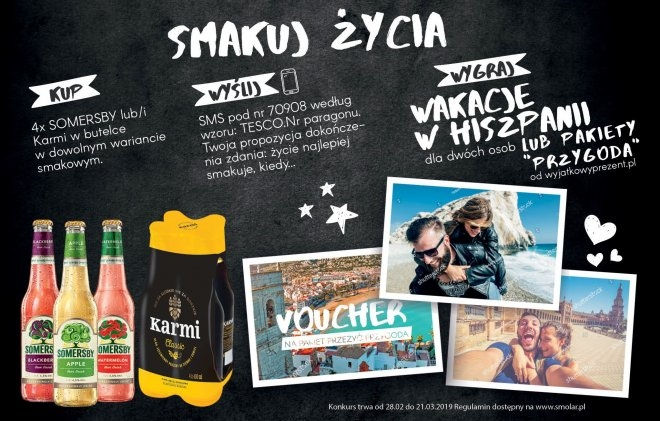 Aby wziąć udział w konkursie należy kupić minimum 4 szt Somersby lub/i Karmi, zachować paragon a następnie zgłosić się do konkursu wysyłając SMS pod nr 70908 według wzoru : Tesco.Nr Paragonu. Twoja propozycja dokończenia zdania: