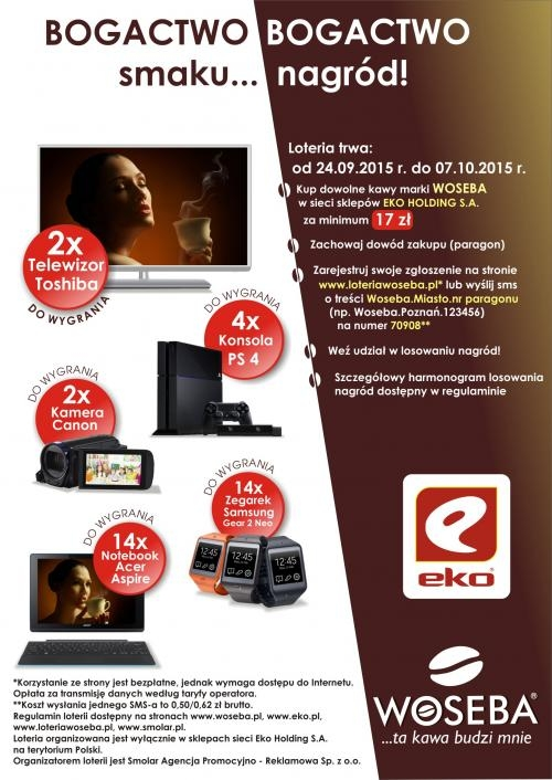 Kup dowolne kawy Woseba w sklepach Eko za minimum 17 zł. Zachowaj paragon i zarejestruj go na stronie lub wyslij sms-em.